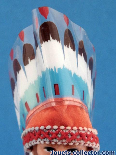 La coiffe de Chef Indien, en tissu et PVC souple, équipant les figurines BIG JIM dans les tenues : Ref : 9413 de 1976 & 1977 et dans les blisters Ref: 9412 & 9945 de la série KARL MAY / WILD WEST. Il existe plusieurs versions, celle-ci est à croix rouge sur fond bleu clair